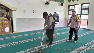 Pantauan di lokasi, personel kepolisian bersama Satpol PP Kecamatan Rancabungur dan warga setempat tampak kompak membersihkan area dalam masjid, mulai dari lantai, karpet, tempat wudhu, hingga halaman sekitar. Debu dibersihkan, lantai dipel, serta fasilitas ibadah dirapikan agar masjid lebih bersih, sehat, dan siap digunakan para jamaah.