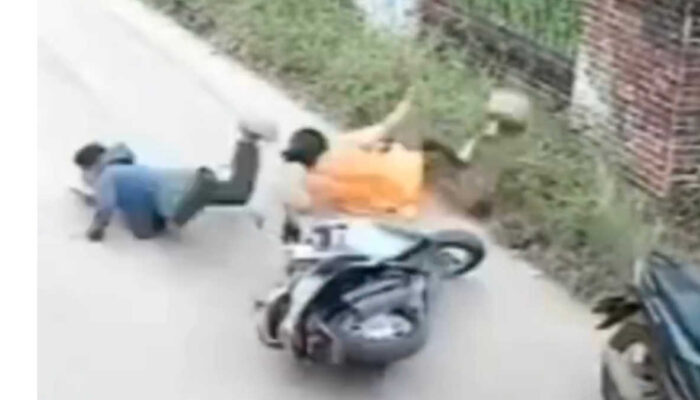 Emak-emak berbaju kuning dengan sigap menghadang laju motor maling tabung gas tersebut. Atas aksinya itu ia sempat terpental karena menghadang motor yang sedang melaju kencang. Namun, maling pun terjatuh dari motornya hingga berusaha melarikan diri.